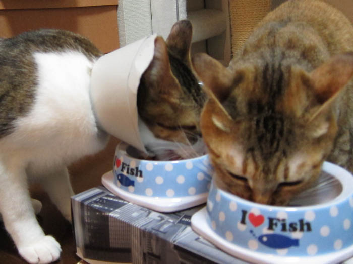 カリカリの上にウェットと薬を一緒に乗せると、2匹はまとめて食べてくれるのでとても助かります。