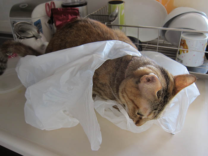 絡み付いて取れないビニール袋に気づいたぴっち♀。