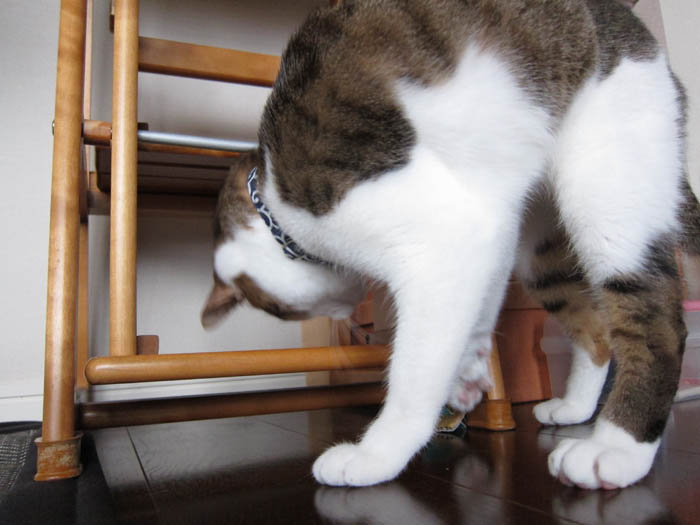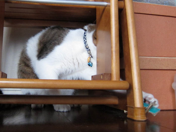 で転がった先は、トイレ、水のみ場、爪とぎの三角地帯の隙間。