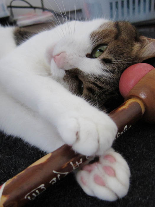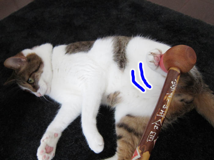 肩たたきのボール部分でぽっけ♂の頭をナデナデ。