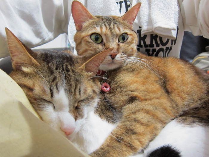 2011年 2/25(金) 923日目のぴっち♀とぽっけ♂ ~洗濯物とお昼寝~新規写真追加。部屋干ししていたはずの洗濯物が……。色々な場所でお昼寝したりポーズにこだわったり。