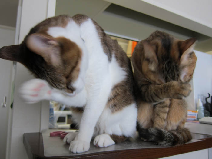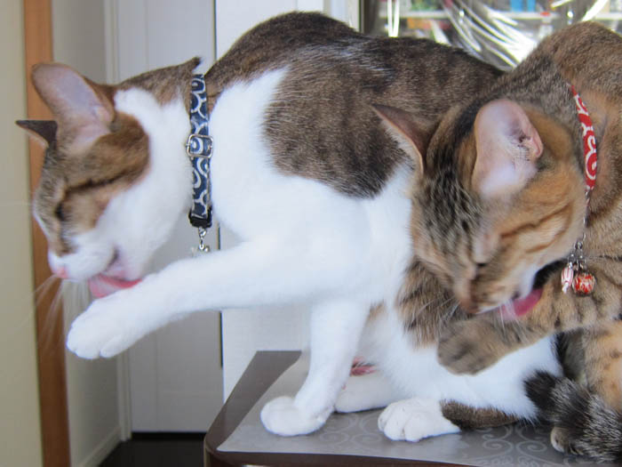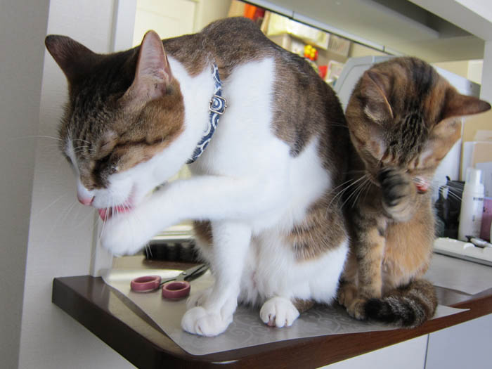 朝ゴハン後の毛づくろいをする2匹ですが、