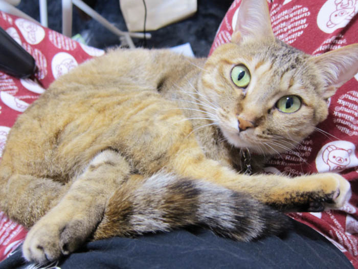 写真の左角に向かって伸びるぴっち♀の右前足と、