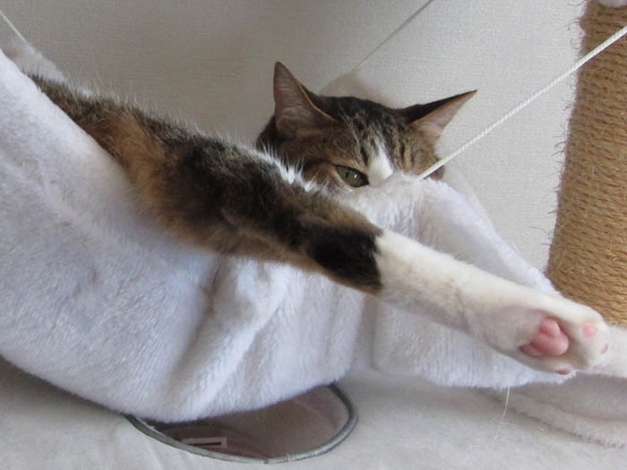 は横からはみ出しつつ前方へ、しっぽはハンモックの縁に沿って上へ。