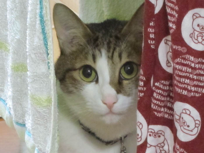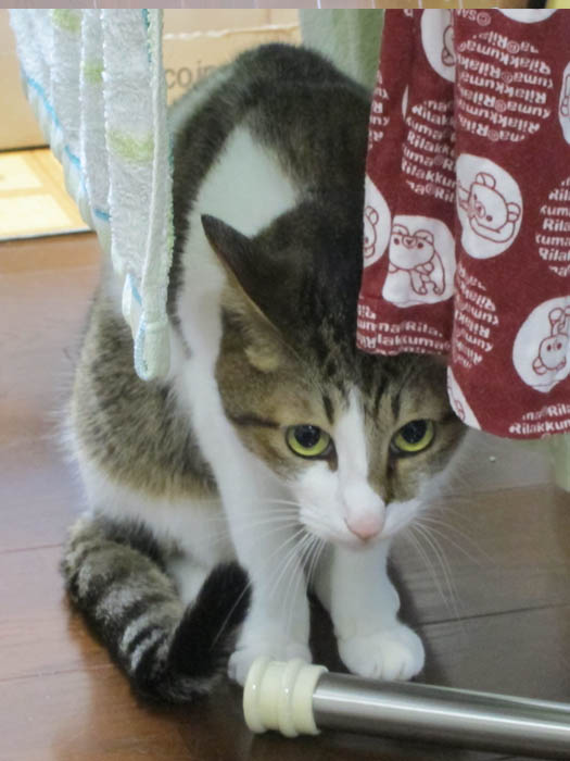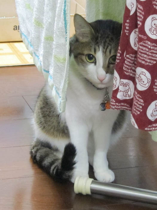 ぽっけ♂が洗濯物の間に逃げ込み(
