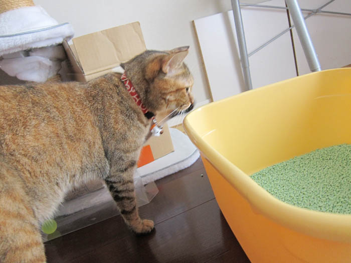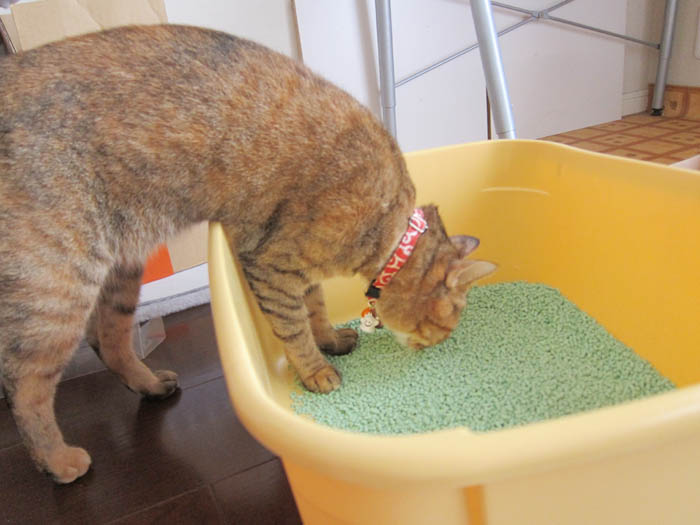 ぽっけ♂が新しくなった猫砂を食べてしまう前に、