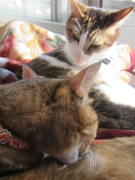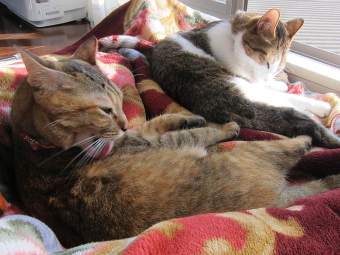 2008年 11/4(火) 80日目のぴっち♀とぽっけ♂ ~移動式猫ベッド~新規写真追加。指先をむっきゃり開いて毛づくろいなぽっけ♂。ぴっち♀はマイペース。