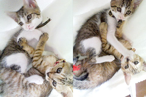 カゴの網目に前脚を突っ込んだりして、お互い遊んでいます。