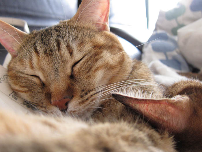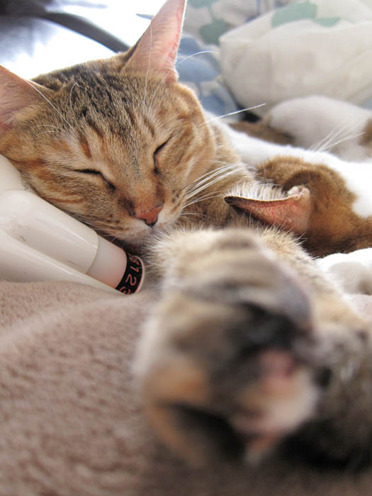 さんぬいぐるみを枕に気持ち良さそうにお昼寝するぽっけ♂。