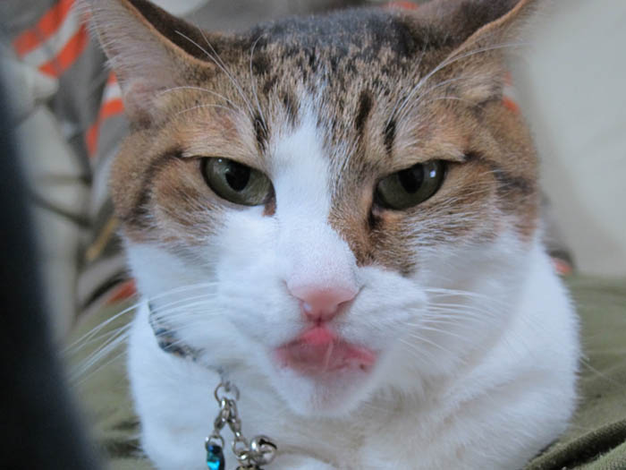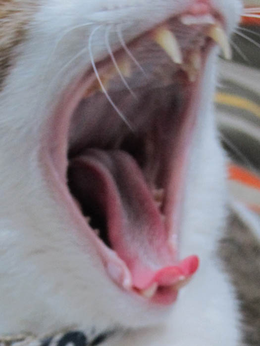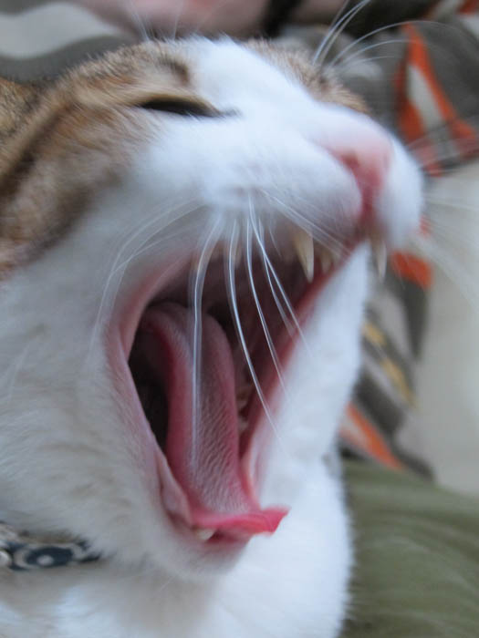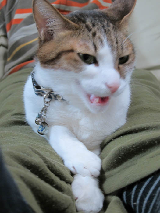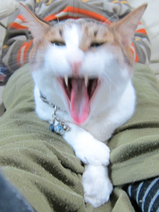 の足の間に寝そべっているぽっけ♂にカメラを向けたら、偶然にもあくびをしてくれました。