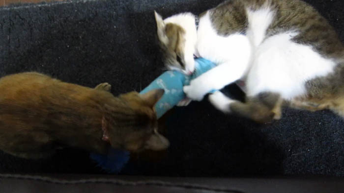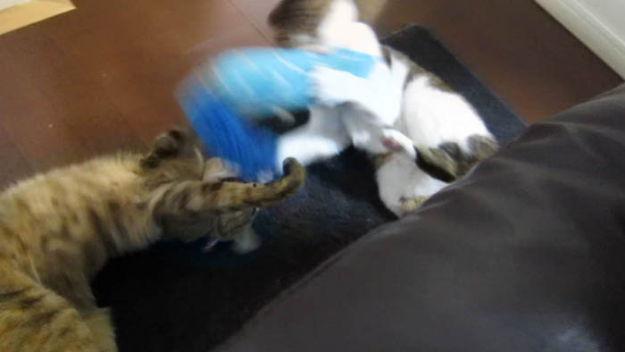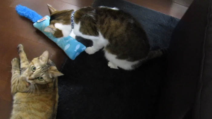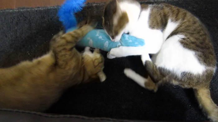 珍しく2匹同時にキッカーで遊んでいます。