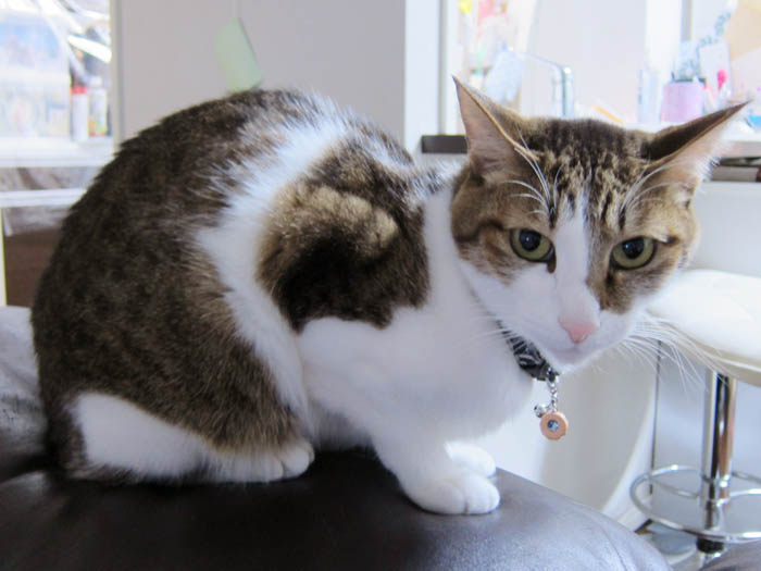 ぽっけ♂がソファーの背もたれに鎮座しています。