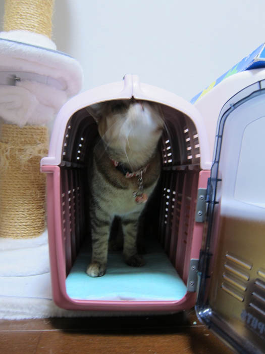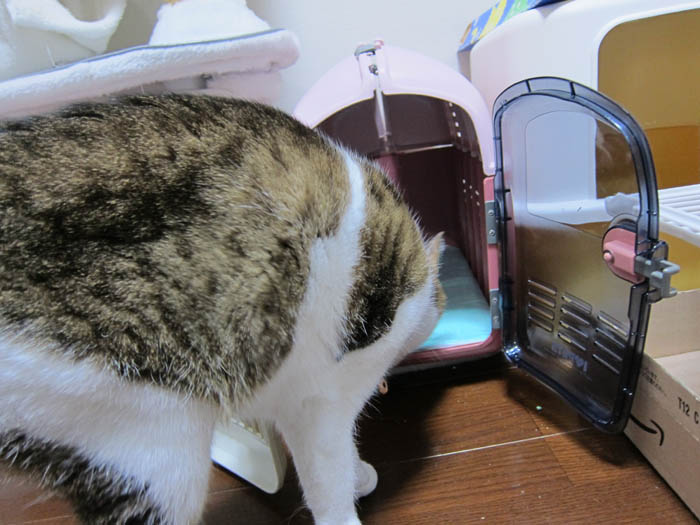 新しいキャリーと、猫トイレの上に乗っている爪とぎを