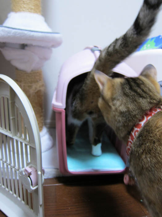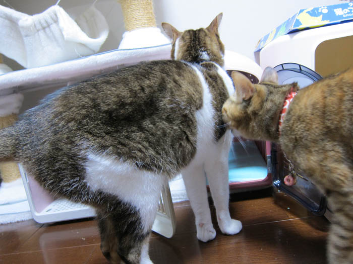 新しいキャリーと見比べているようです。