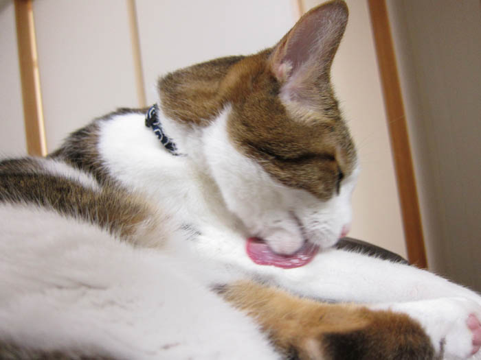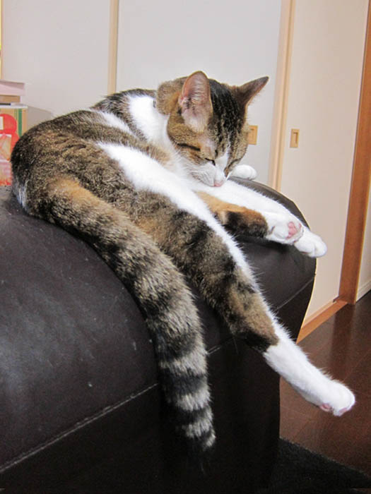 2011年 10/12(水) 1152日目のぴっち♀とぽっけ♂ ~ゆったりぽっけ♂~ぽっけ♂が目をパッチリ素敵に。寝そべりスタイルのポイントはしっぽと後足です。