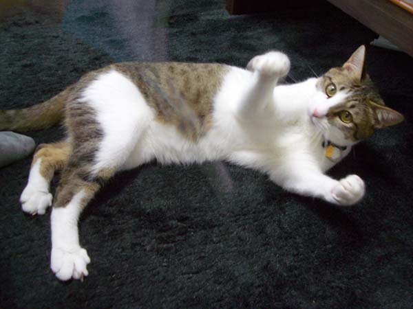 コロンと寝転んで、迎撃準備万端のぽっけ♂。