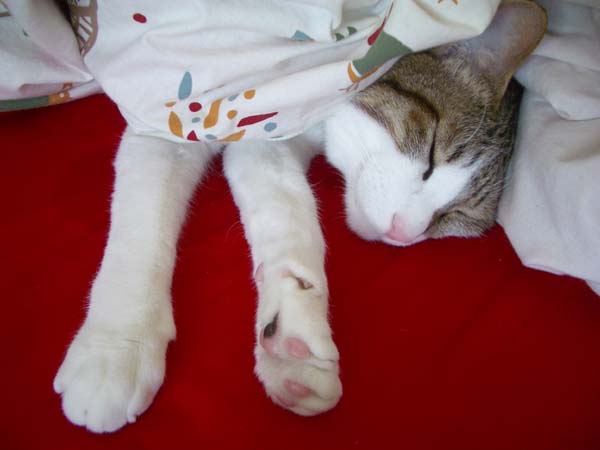 」ぽっけ♂は、日陰にあるソファーの羽毛布団の中で