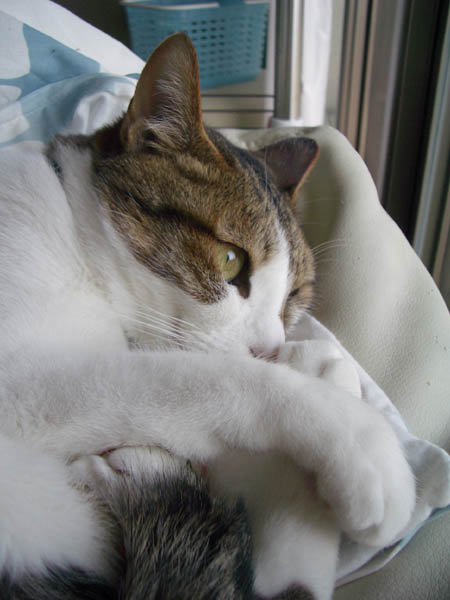 をちょいっと伸ばして、外を見やるぽっけ♂。