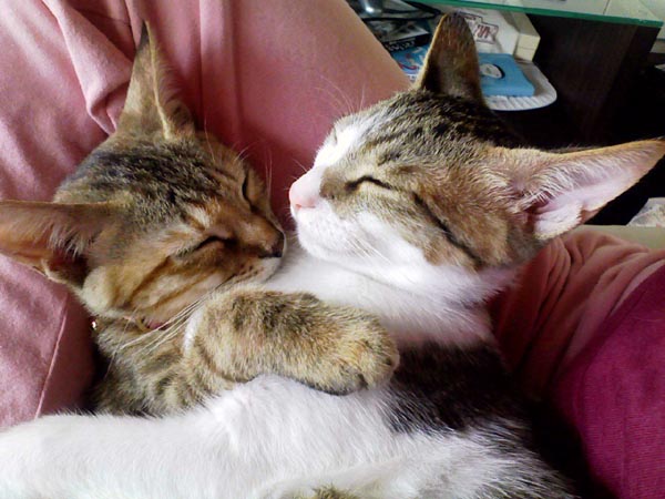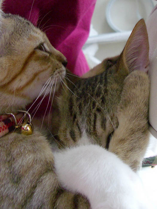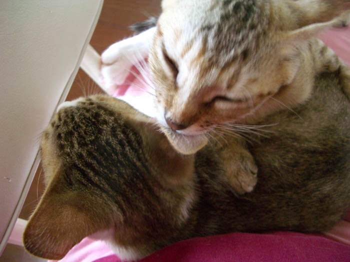 ぽっけ♂の毛づくろいを始めたぴっち♀。