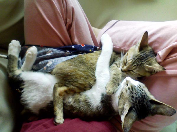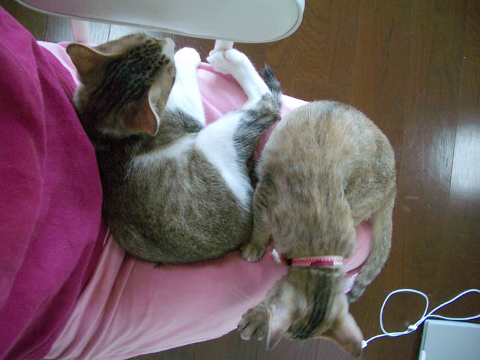 ちゃっかりぽっけ♂の体に上半身を乗せて