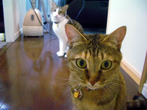 がすぐにゴハンをあげないことを知っているので、2匹に甘いREI
