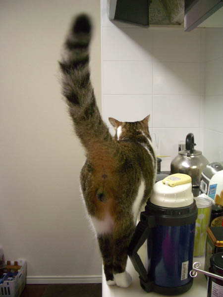 ぴんと伸びたしっぽを壁のタイルに押し付けたままで。