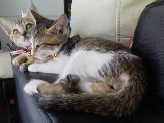 ソファーの肘掛けがお気に入りらしい2匹。