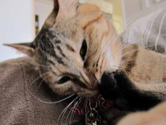 ぴっち♀がソファーに寝転がって、毛づくろいを始めました。