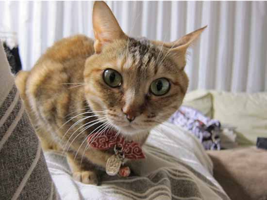ソファーの倒した背もたれの上で、座してゴハンを待っています。