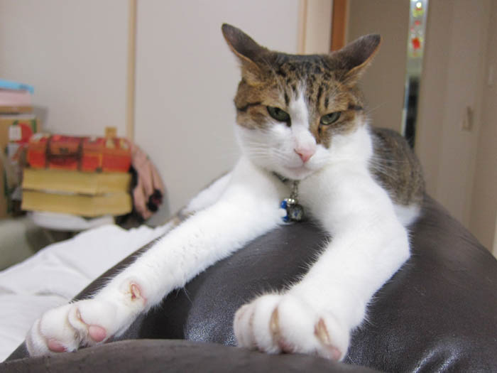 2011年 8/26(金) 1105日目のぴっち♀とぽっけ♂(2)動画 ~エア・猫キック~ぴっち♀に猫キッカーを取られ、ぽっけ♂が……。エア・ギターならぬ、エア・猫キック。