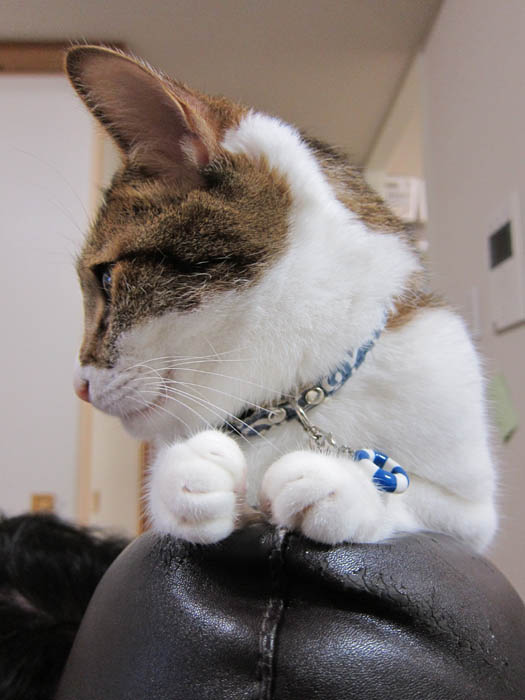 ソファーの背もたれに鎮座中のぽっけ♂。