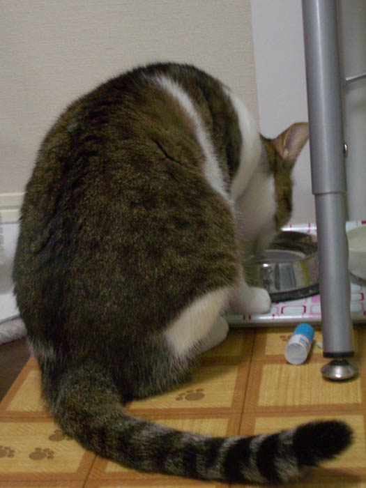 物足りないようで、お皿の前で追加を要求するぽっけ♂。