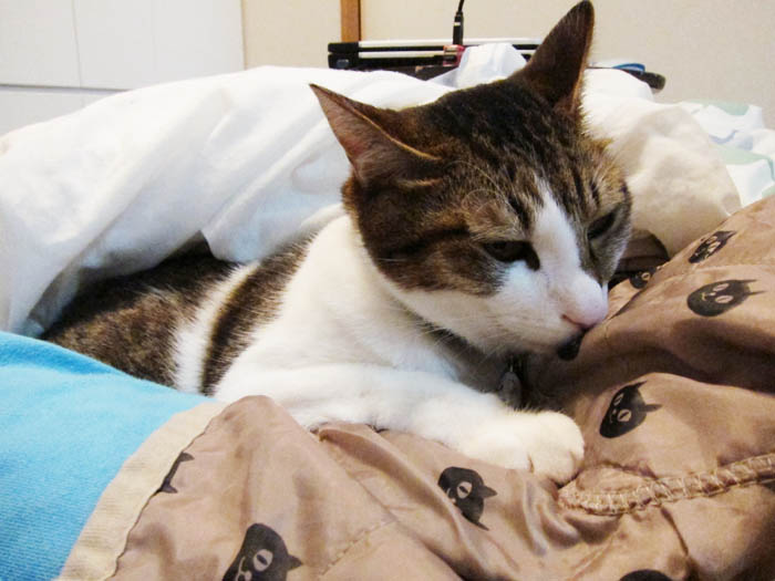 が泊まりに来ています。ぽっけ♂は羽毛布団をかけている母親