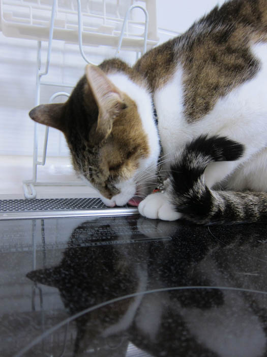 美味しい匂いの漂う、グリルの換気口を舐め始めました。