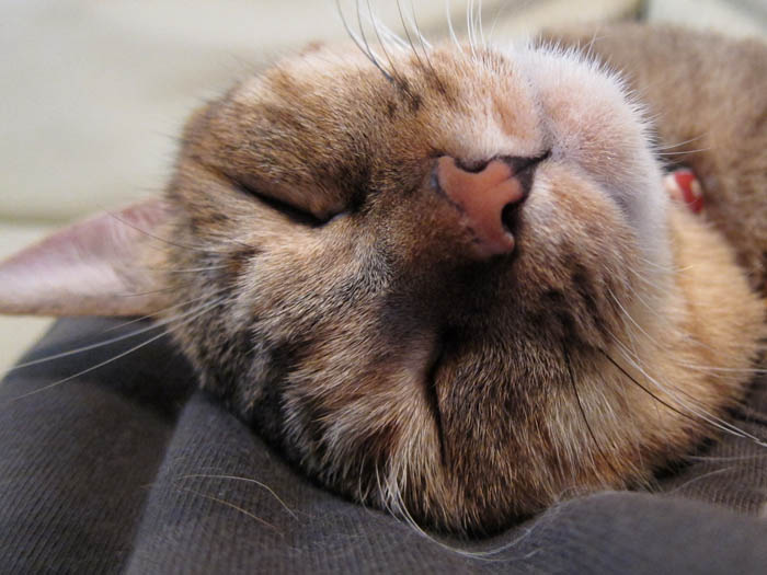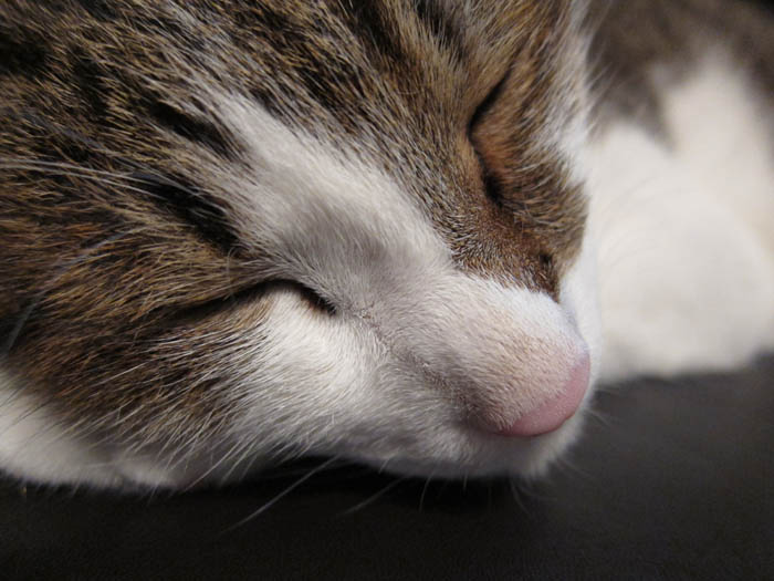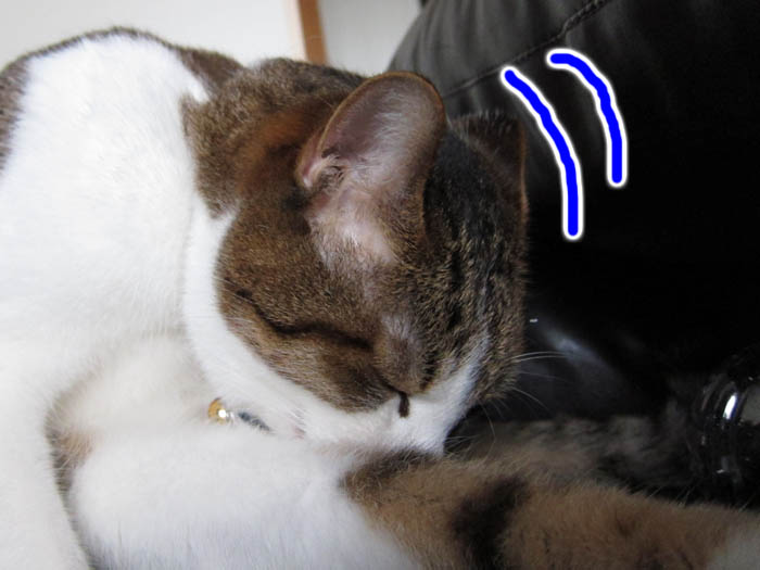 で再び胸元をカシカシした際、上掛けをちょっと持ち上げたところ、布団の中にもぐりこんで中でUターンすると、頭を布団から出しつつ腕枕で眠りについたぽっけ♂。