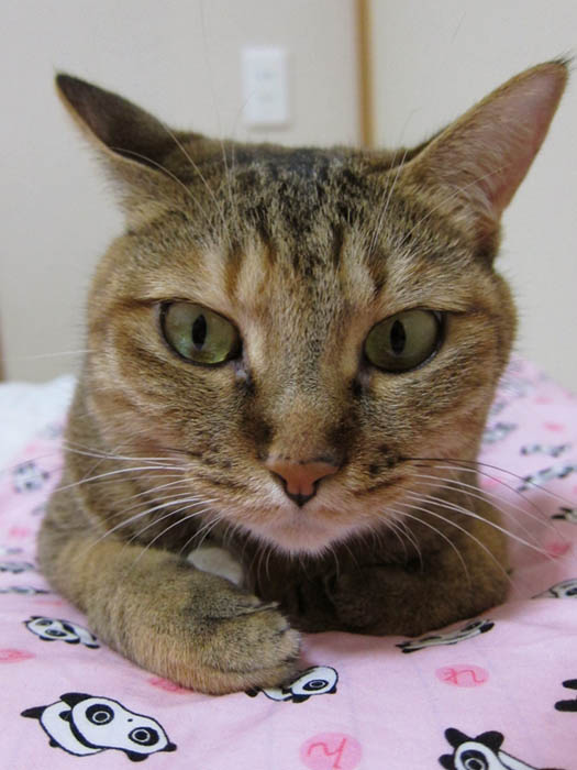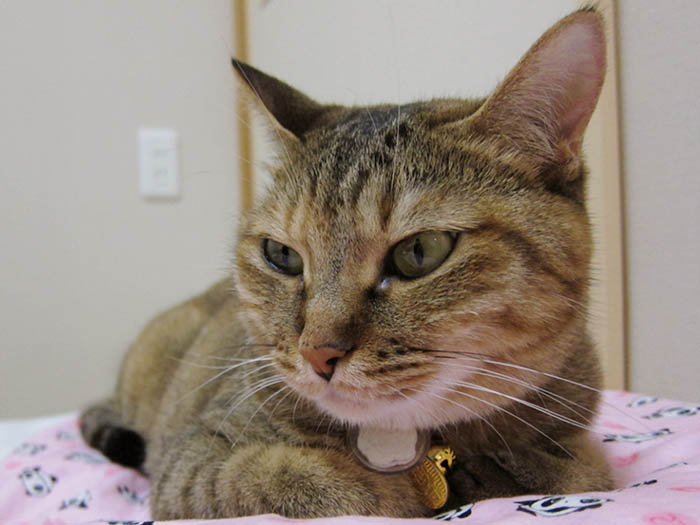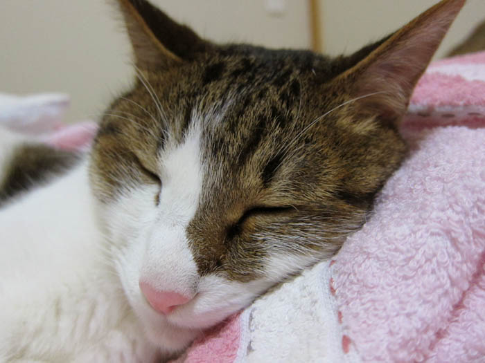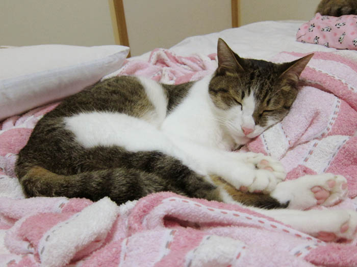 が寝ていた布団の「枕」に陣取り、自分の場所とばかりに居座っています。