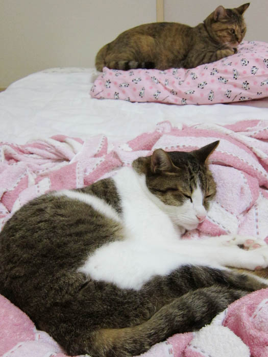 朝4時半。外が明るくなってくるとともに目を覚ました2匹は、和室で眠る母親