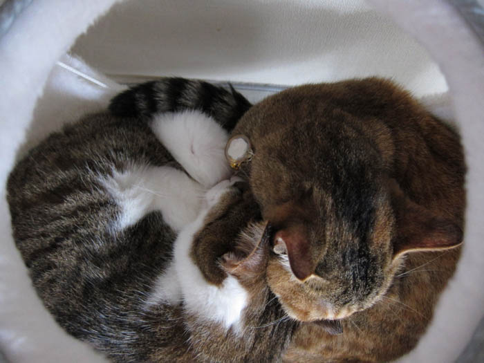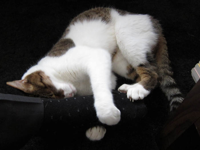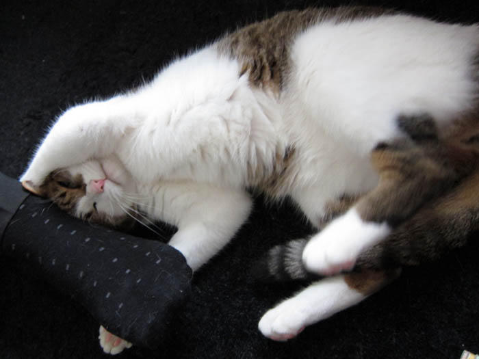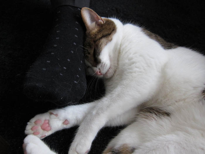 2010年 7/25(日) 708日目のぴっち♀とぽっけ♂ ~たまにはぴっち♀枕~ 低反発マットでお昼寝の2匹。黒いカバーに猫毛がビッシリ。もう……スゴイです