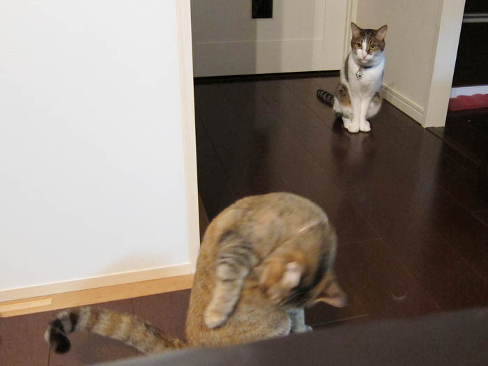 朝、2匹を捕まえて和室に入れようと近寄ったら……。