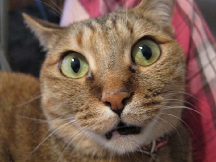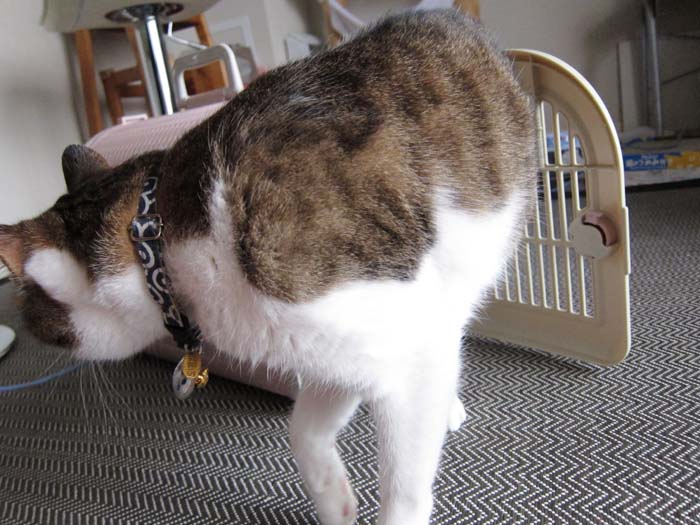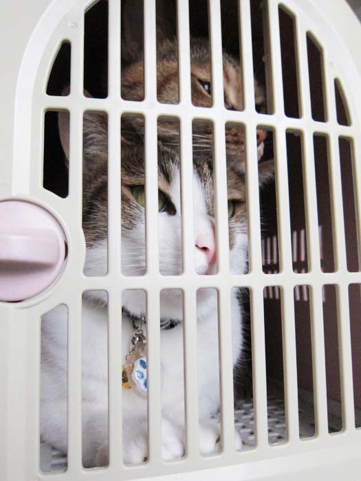 嫌がりながらも、キャリーの中央にのっしりと座るぽっけ♂。