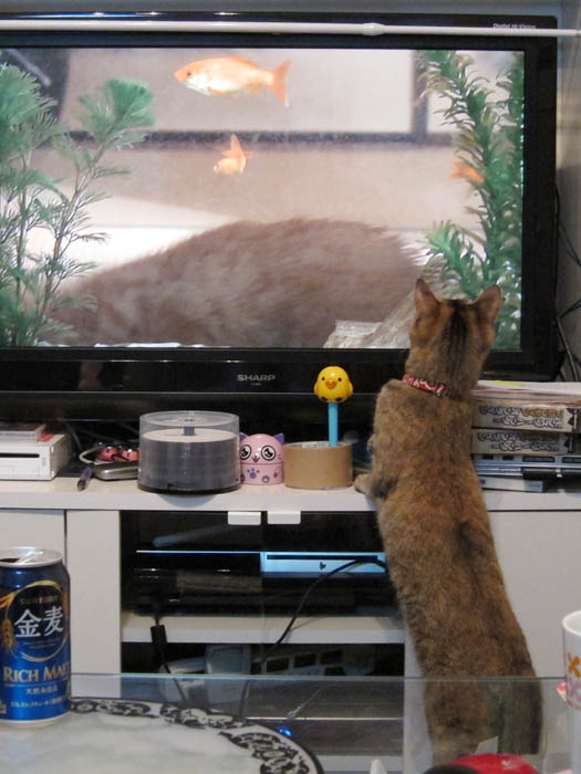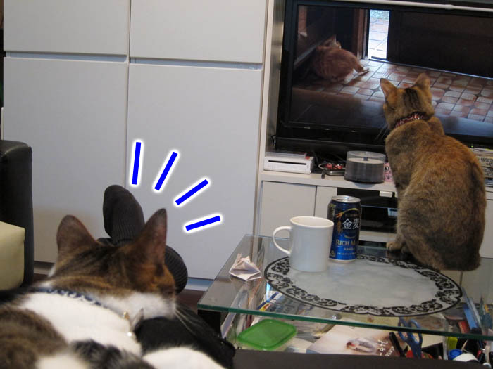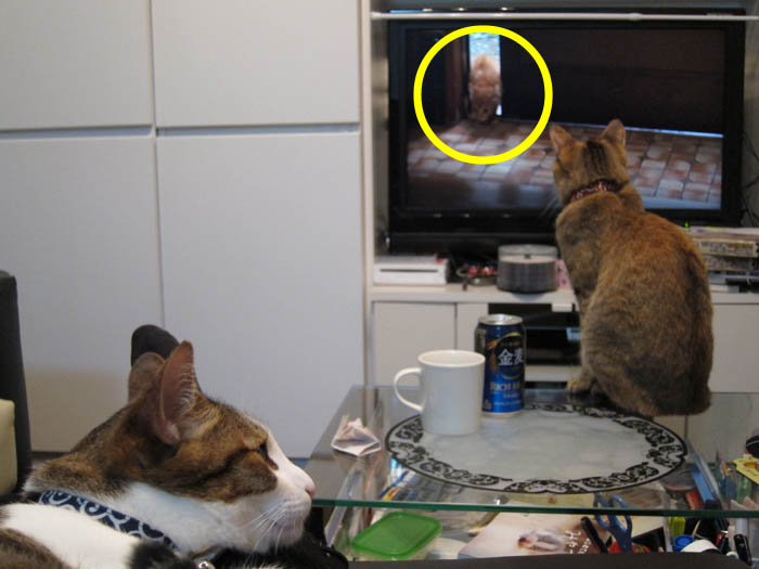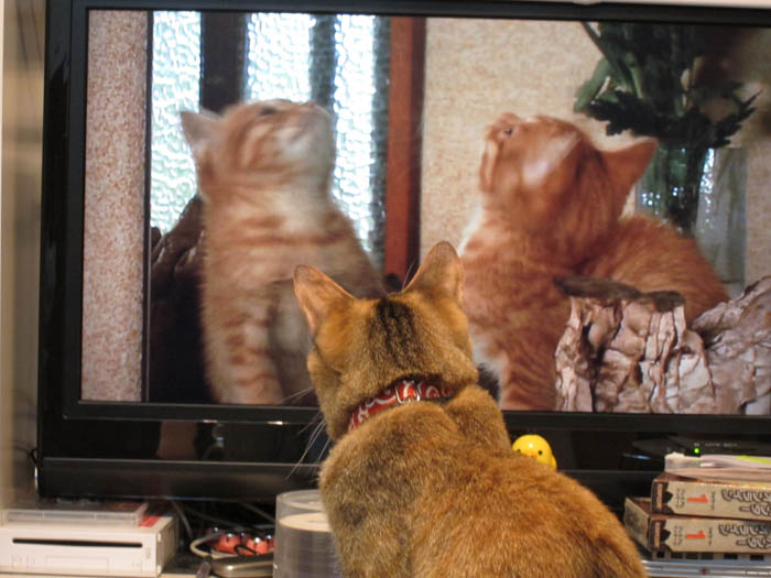 テレビ画面に映る猫に気がつきました。