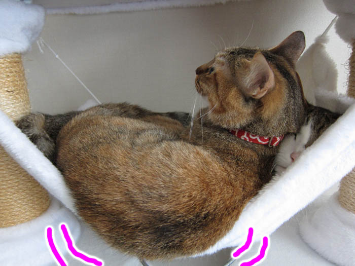 ハンモックで寝るか、ここで寝るかを悩んでいるようです。