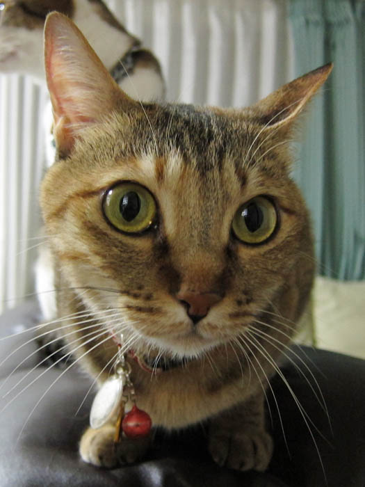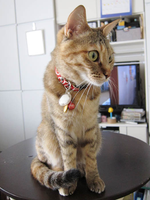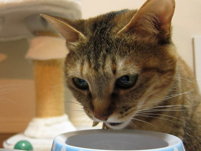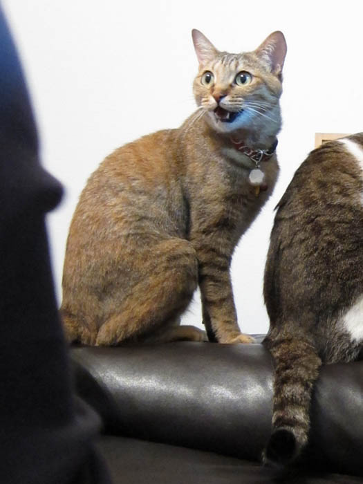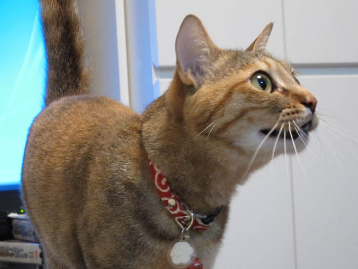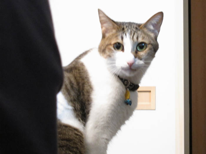 の背を見つつ、寝る前のゴハンをアピール中のぽっけ♂。