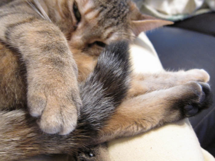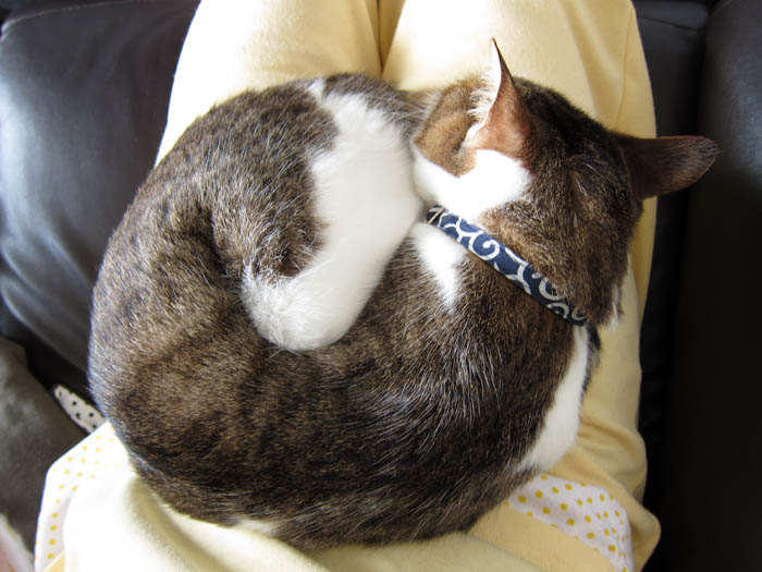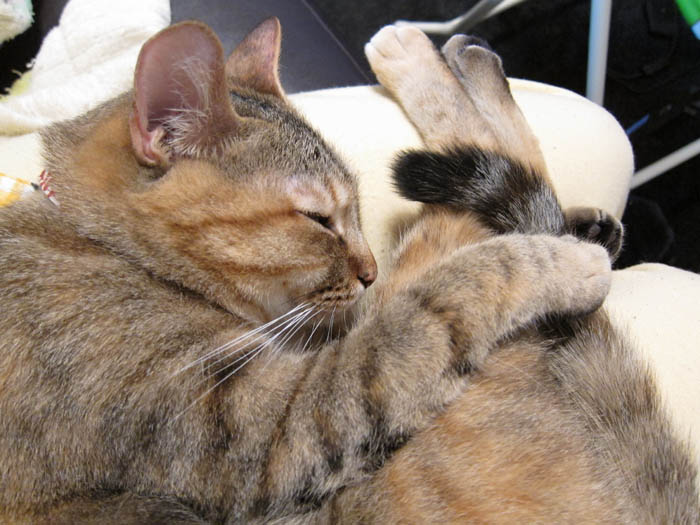 2010年 5/31(月) 653日目のぴっち♀とぽっけ♂ ~食後の膝乗りお手入れ~新規写真追加。ご褒美のカリカリをもらって満足した2匹の毛づくろい。前足あむあむぴっち♀が可愛いです。