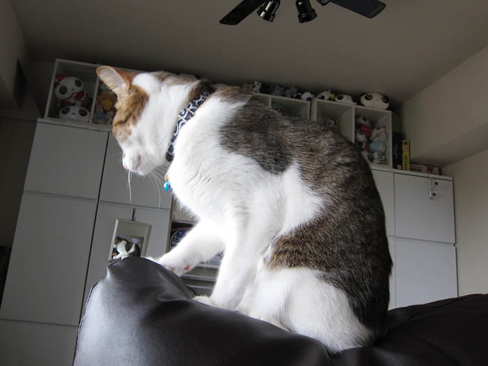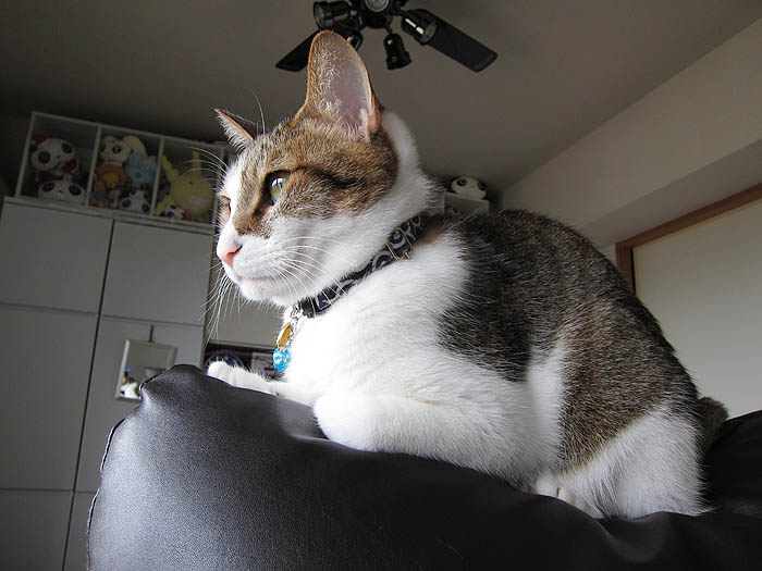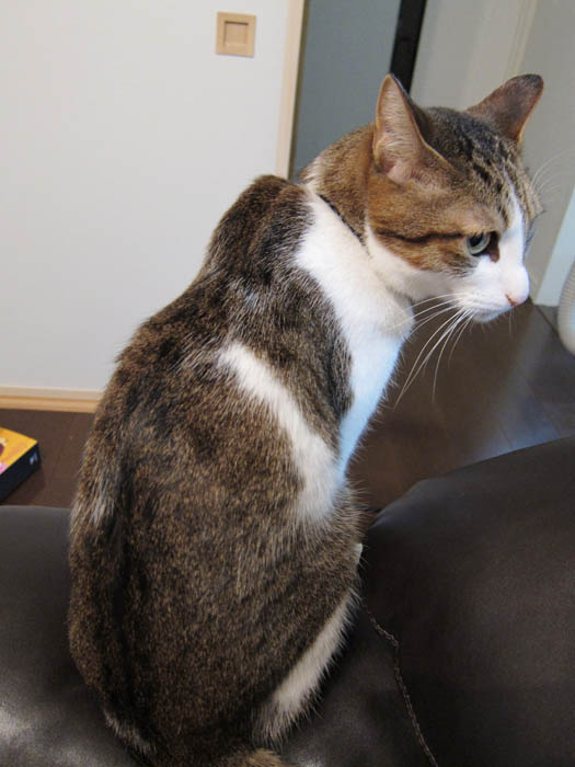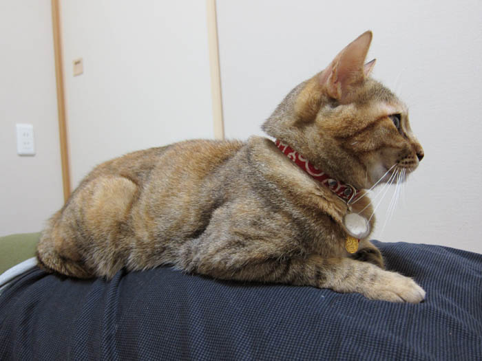 倒した背もたれの上で箱座り中のぽっけ♂。