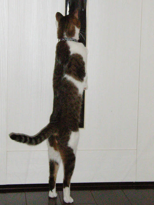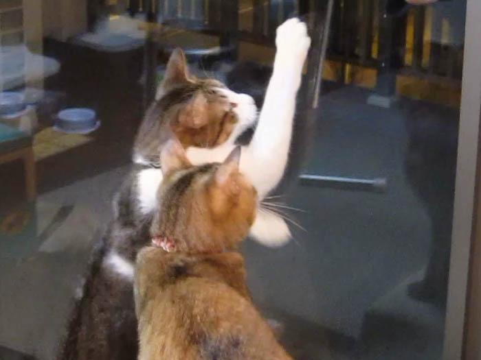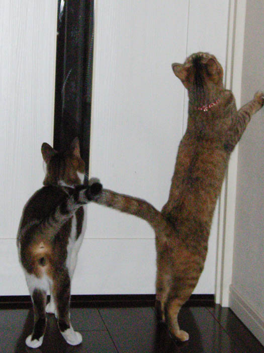 玄関を開けると、リビングのドアのガラス窓越しに2匹が立ち上がったりしながら盛大にコールしています。