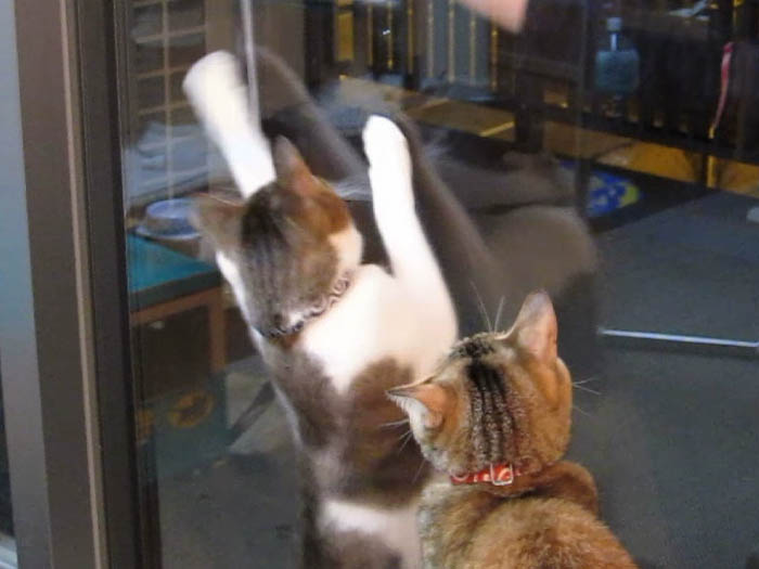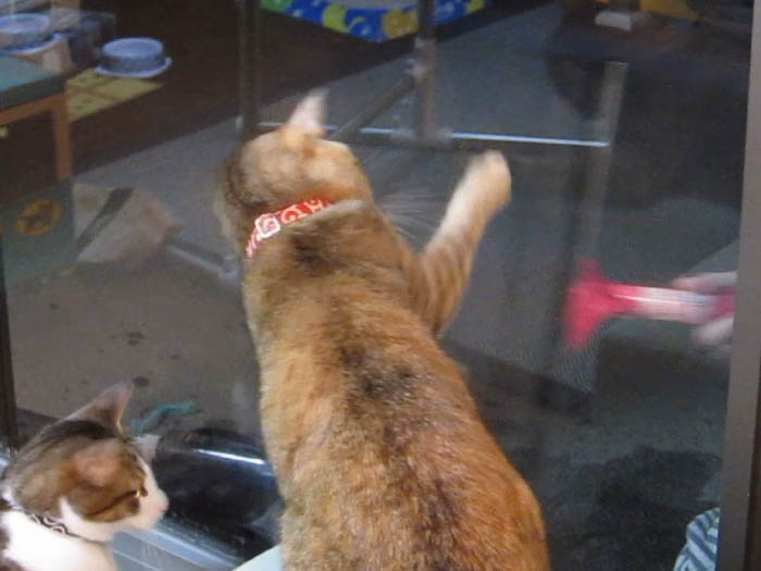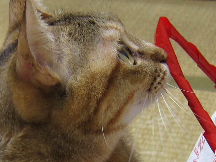 ぽっけ♂の気を引くべく、オモチャをヒラヒラ。