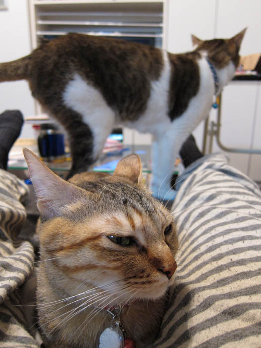 が外出するので2匹は解散となりました。2人の膝の上に収まる2匹。