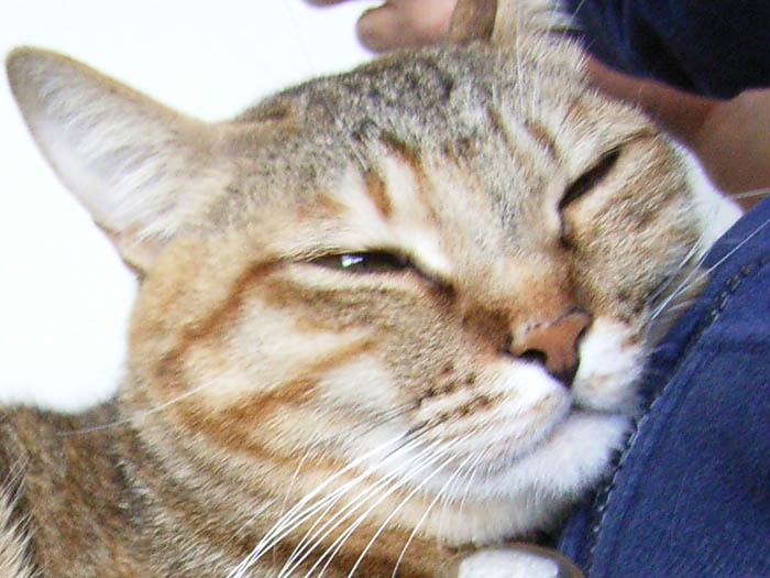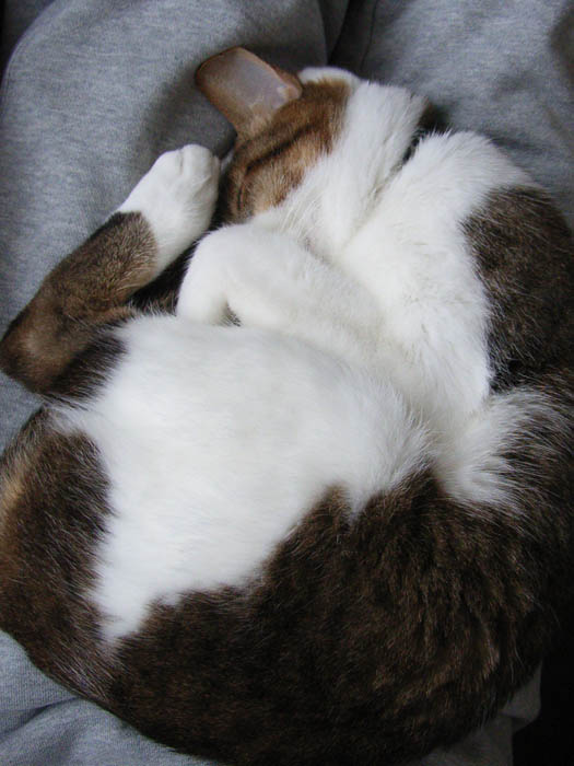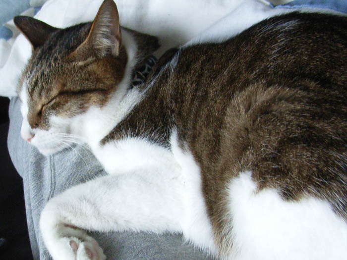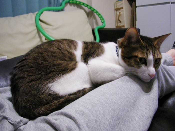 の上へと移動しました。膝の辺りに顔を乗せ、いつものお昼寝体勢です。