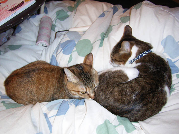 と一緒に寝た2匹。猫ベッドよりも人間つき布団がお気に入りらしく、